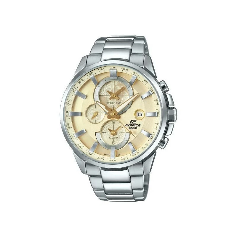 Montre en résine avec verre minéral – Boîtier en acier fin massif – Bracelet en acier inoxydable – Fonction d’heure : Universelle – Affichage d’un second fuseau horaire – Double affichage – Indication de la date – Alarme Simple – Fermoir de sûreté – Étanchéité : 10 bars