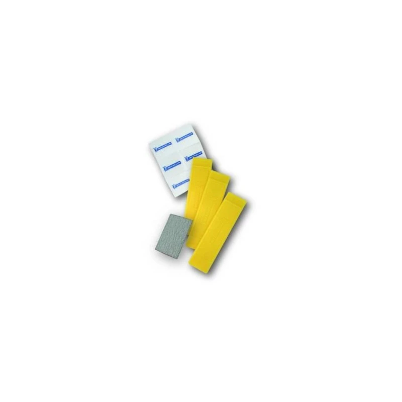 Nécessaire réparation, jaune, blanc et gris, contenant : 3 démonte-pneus très résistants, 6 pièces de réparations autocollantes et une râpe.