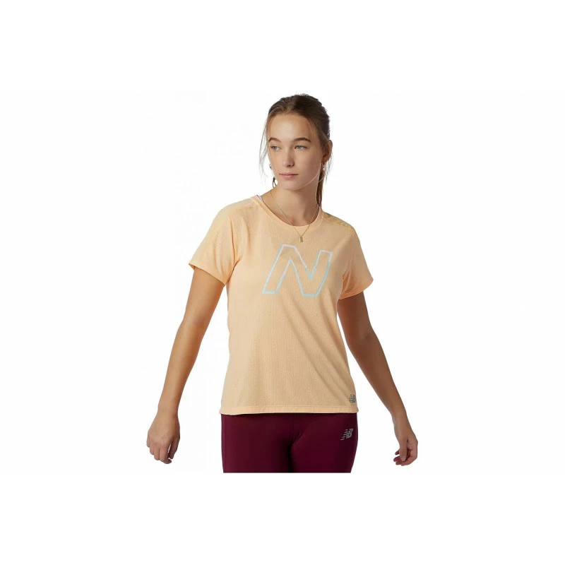 Le tee-shirt manches courtes New Balance Impact Run Printed pour femme et sa grande légèreté vous accompagnent lors de vos sessions de running estivales.