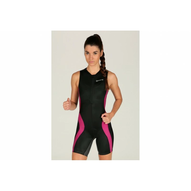 Pour améliorer vos performances en triathlon, offrez-vous la combinaison de compression Skins TRI400 noire et rose pour femme (Collection Printemps/Eté).